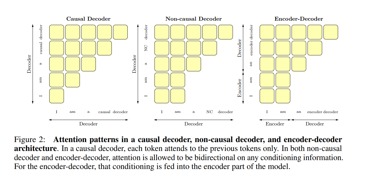 值得一提的是,一部分双向attention的encoder-decoder和Prefix-LM(non-causal decoder)并没有被大部分大模型工作采用(它们也能兼顾理解和生成,泛化性能也不错),是因为: